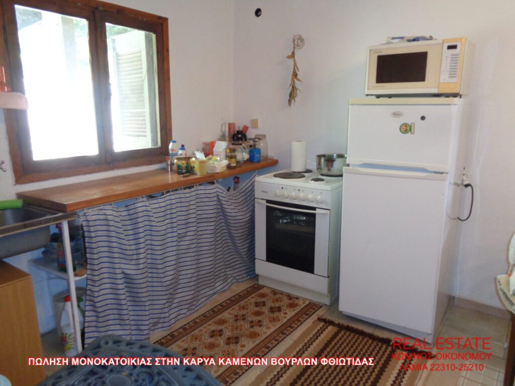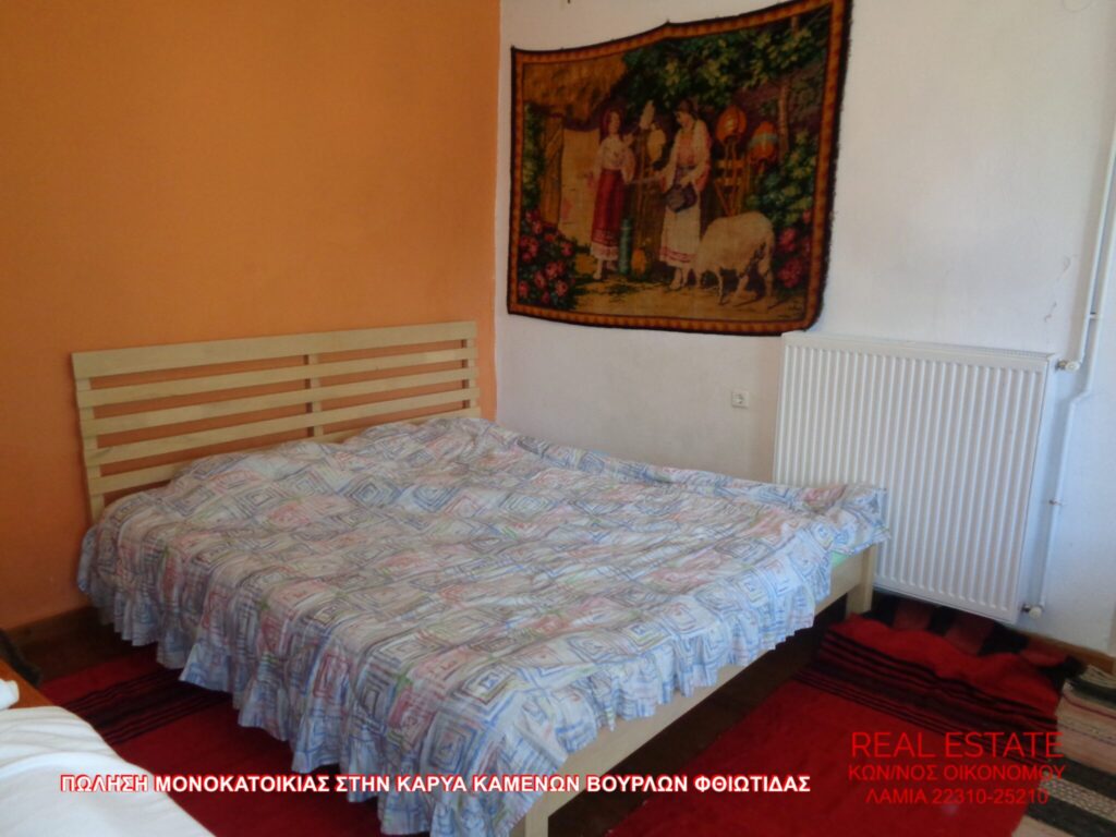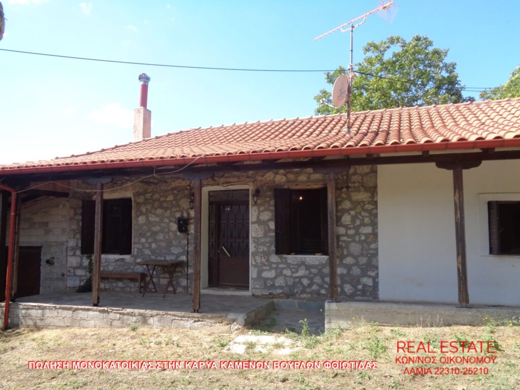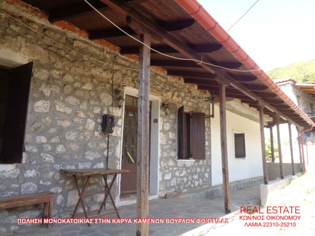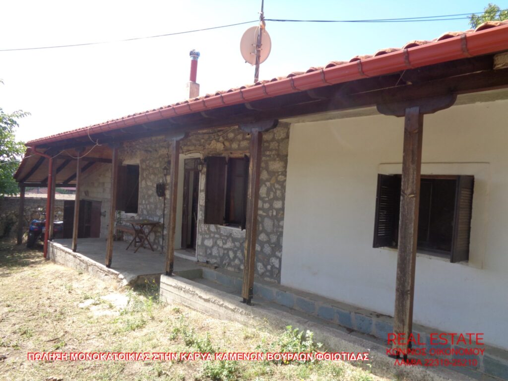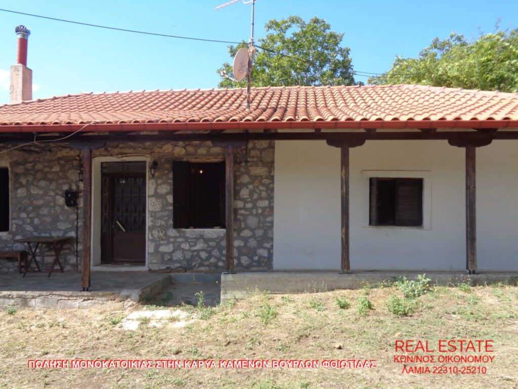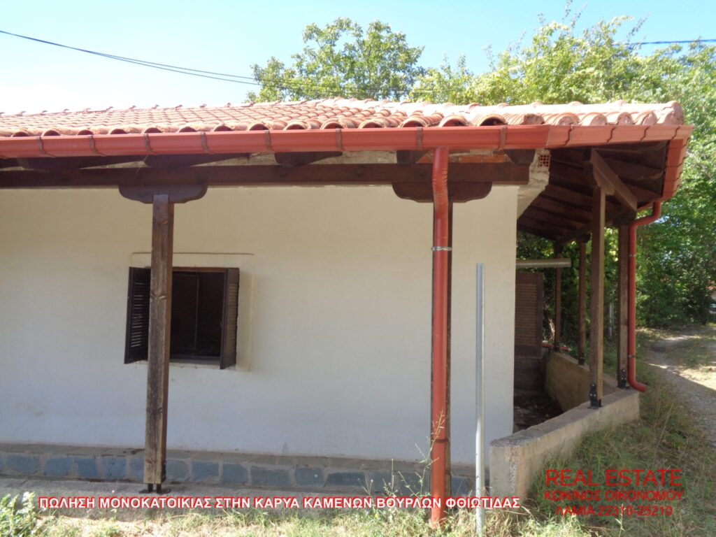 Πωλείται μονοκατοικία, στην Καρυά Καμένων Βούρλων Φθιώτιδας. Είναι 70 τ.μ., πέτρινη, πλήρως ανακαινισμένη προ 5ετίας και φωτεινή. Αποτελείται από σαλόνι, κουζίνα, ένα υπνοδωμάτιο και λουτρό. Διαθέτει αυτονομία θέρμανσης με καλοριφέρ, τζάκι, αποθήκη εκτός του σπιτιού, αυλή και υπέροχη θέα. Υπάρχει πλάκα και κεραμοσκεπή στην οροφή. Βρίσκεται σε 150 τ.μ. οικόπεδο και απέχει 10 χιλιόμετρα από τα Καμένα Βούρλα. Τιμή πώλησης 63.000 ευρώ.