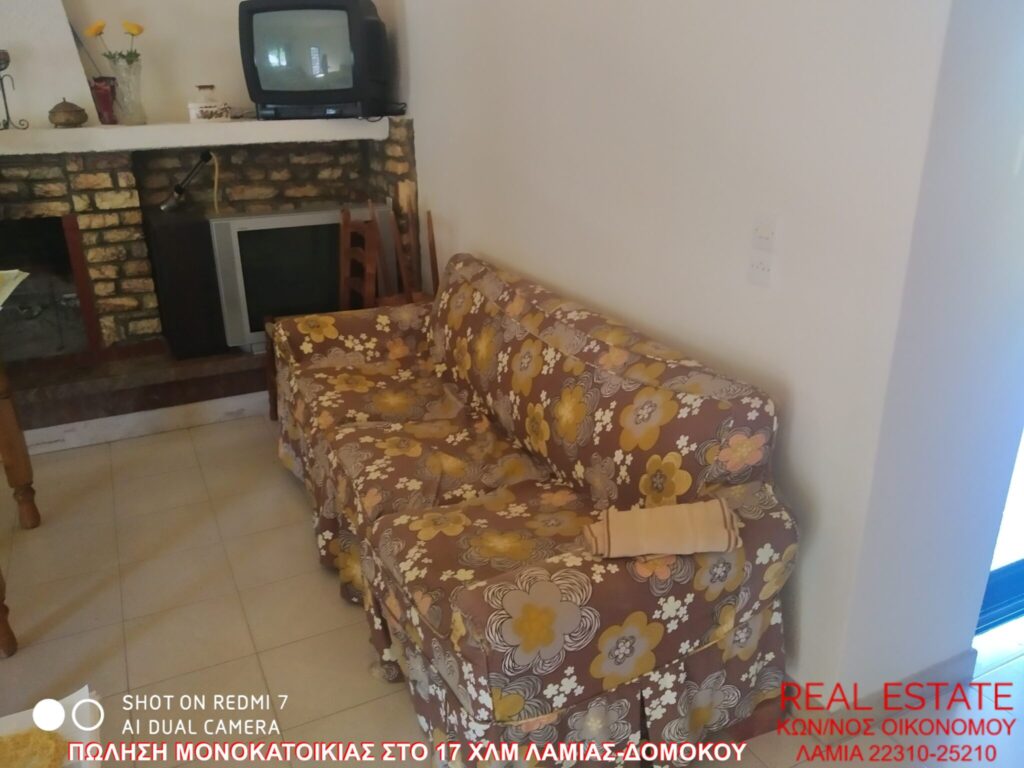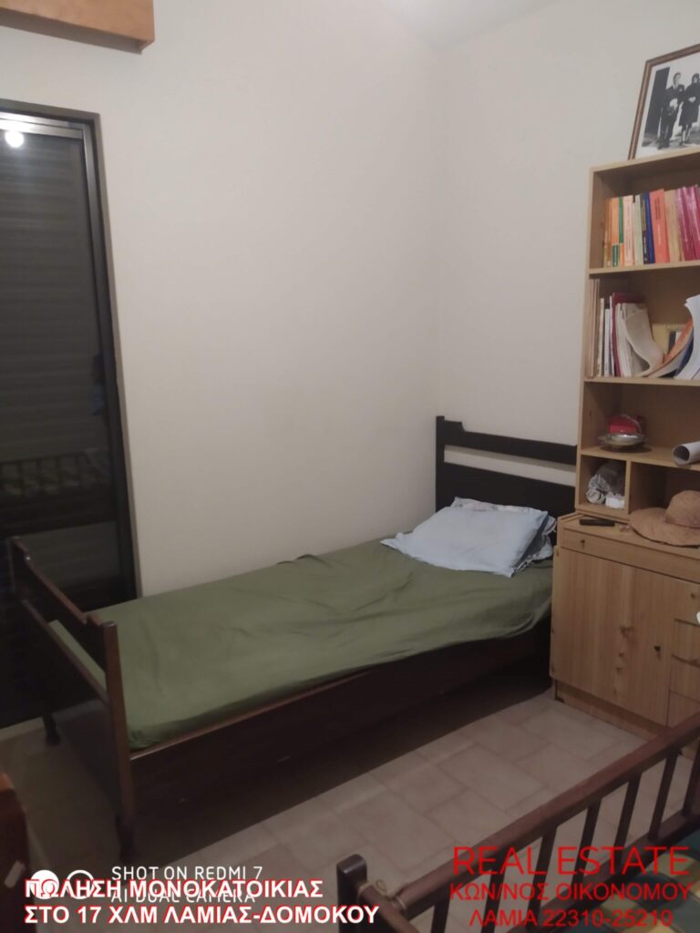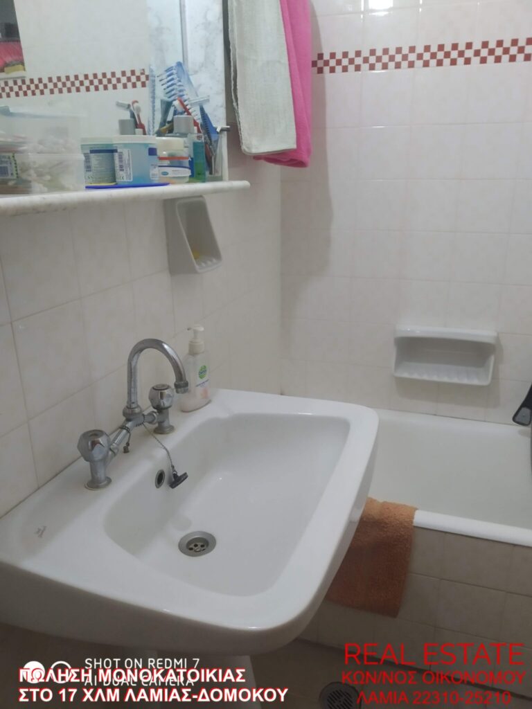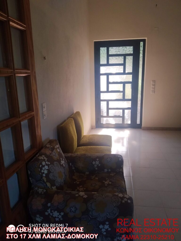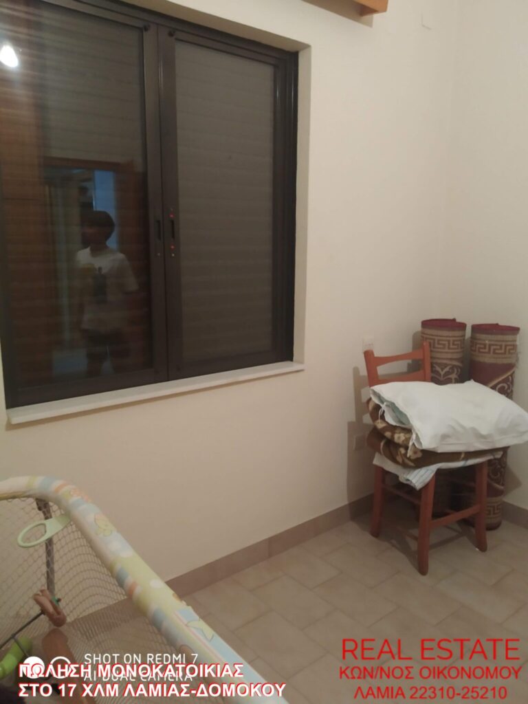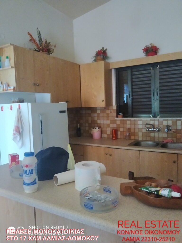 Πωλείται μονοκατοικία, στο 17 χλμ Λαμίας-Δομοκού. Αποτελείται από ημιτελές, ισόγειο διαμέρισμα, με ηλεκτρολογική και υδραυλική εγκατάσταση και από διαμέρισμα 1ου ορόφου 80 τ.μ., με ενιαίο χώρο σαλόνι-κουζίνα, δύο υπνοδωμάτια και ένα μπάνιο. Διαθέτει τζάκι, κουφώματα αλουμινίου, διπλά τζάμια, σίτες και βεράντα. Η μονοκατοικία βρίσκεται σε 5 στέμματα περιφραγμένο οικόπεδο, με κεραμοσκεπή και όμορφο κήπο με πολλά οπωροφόρα δένδρα. Η κατασκευή της έγινε το 1990. Τιμή πώλησης 75.000 ευρώ.